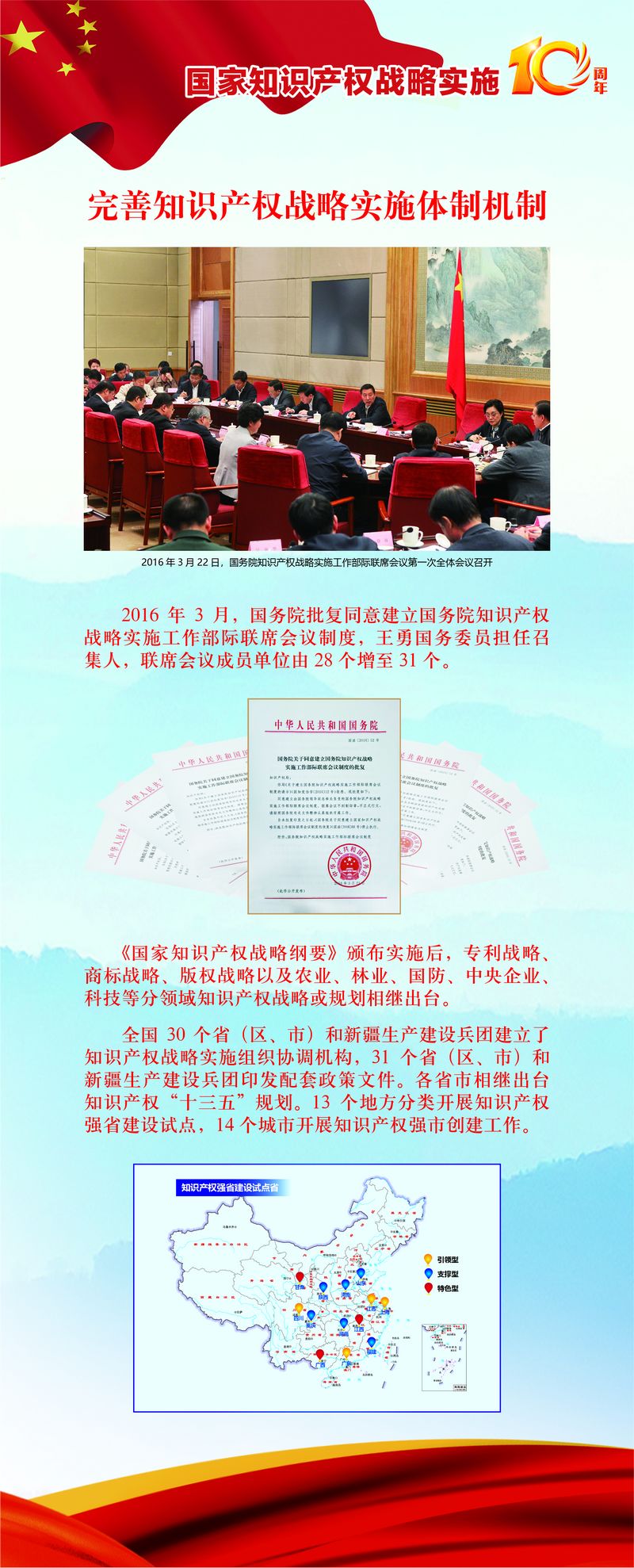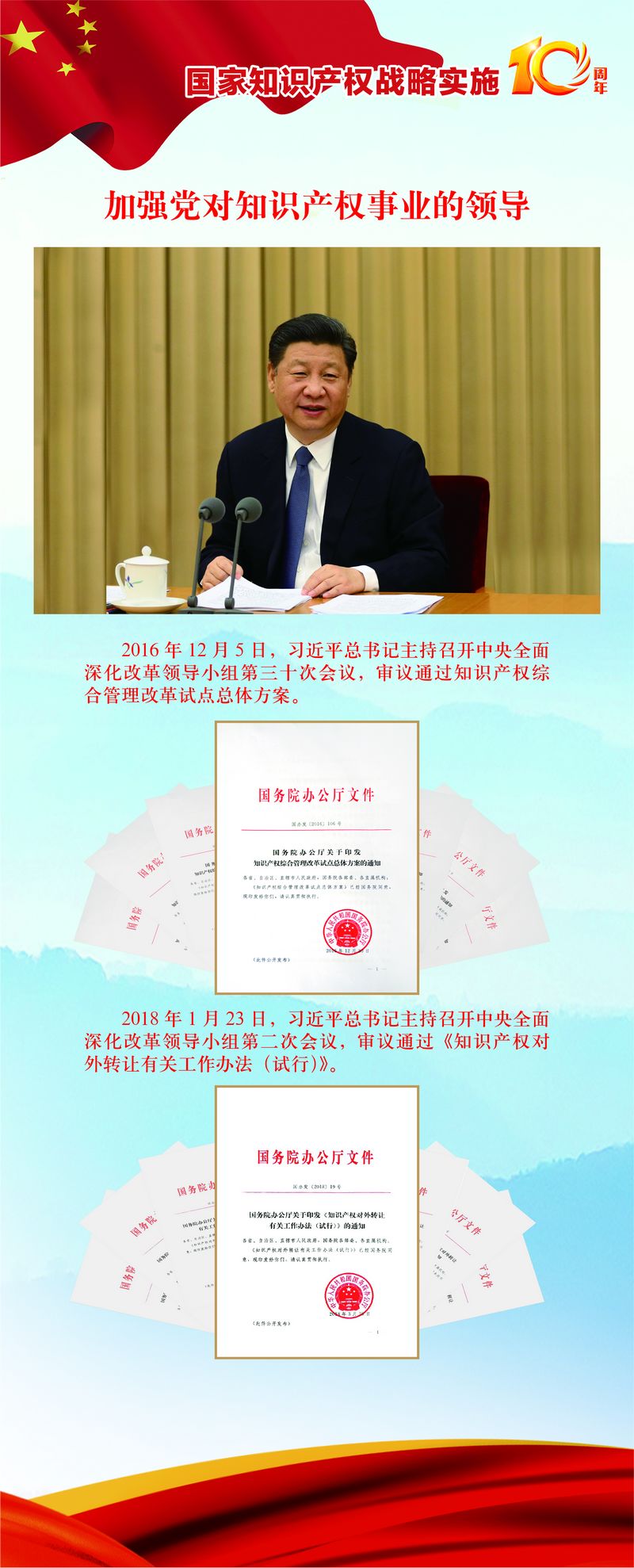 國家知識產(chǎn)權戰(zhàn)略實施10周年,加強黨對知識產(chǎn)權事業(yè)的領導。
