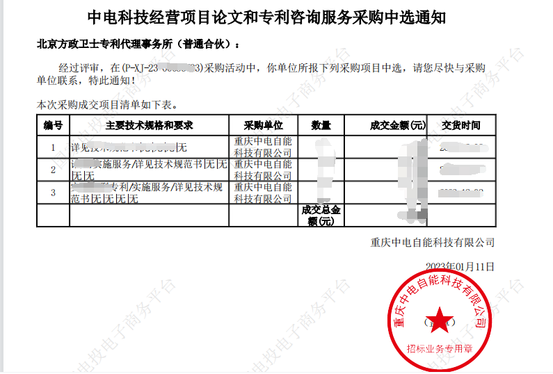 熱烈祝賀我所于2023年1月9日(北京方政衛(wèi)士專利代理事務(wù)所(普通合伙))中標(biāo)重慶中電自能科技有限公司專利代理及論文咨詢項(xiàng)目。